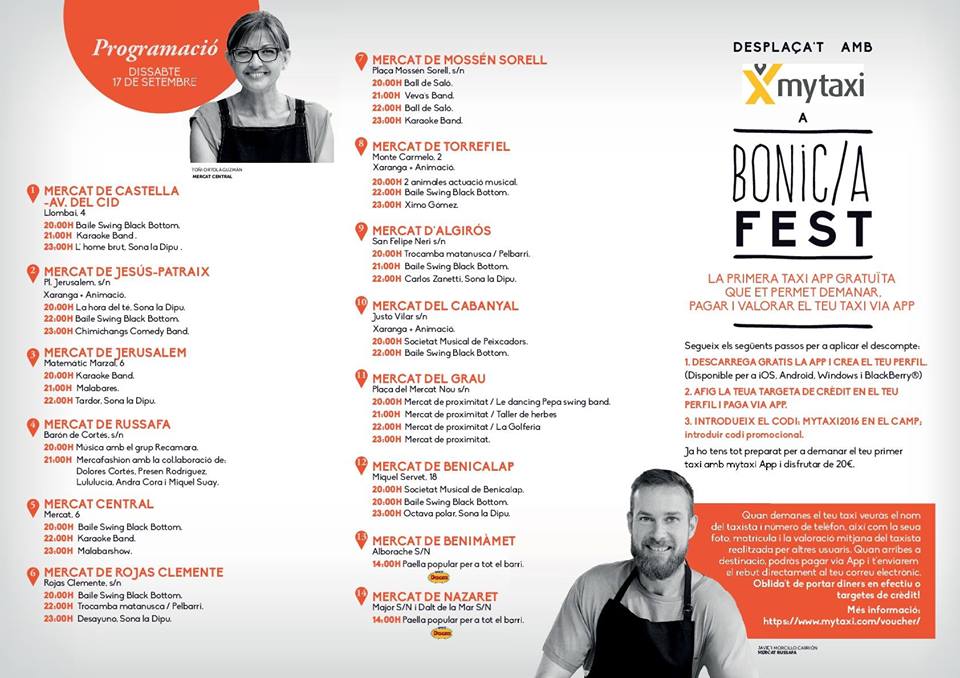 | El sábado 17 de septiembre 12 de los mercados municipales de Valencia organizan un festival diferente y lleno de actividades culturales. Esta iniciativa tiene como objetivo acercar a la gente la cultura del mercado y para ello se han organizado actividades gastrónomicas, exhibiciones de baile, música en directo, actuaciones de todo tipo, paellas populares, etc. Si quieres conocer la programación completa visita Bonic/a Fest | ||