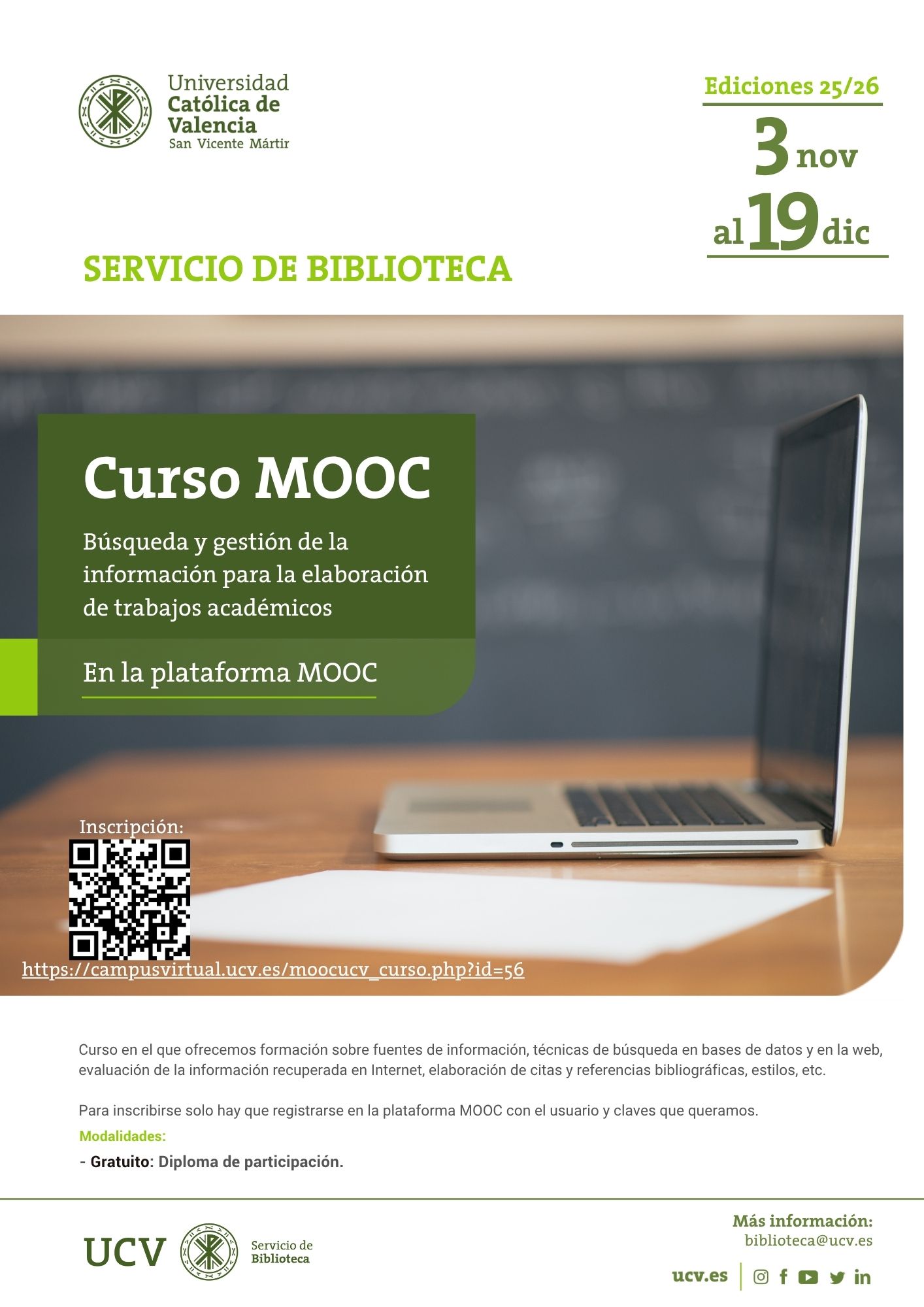 Para más información e inscripción visitad https://campusvirtual.ucv.es/moocucv_curso.php?id=56